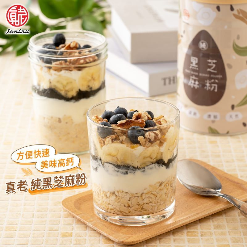 真老黑芝麻粉2湯匙、燕麥片 1/2 杯、牛奶(優格、豆漿或椰奶) 1/2 杯、蜂蜜 1 湯匙、新鮮水果、適量堅果