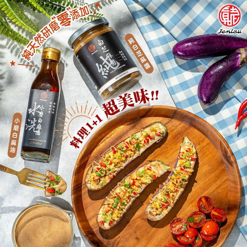 真老小磨白麻油3湯匙、茄子2顆、橄欖油1匙、蒜末2湯匙、鹽適量、黑胡椒適量、真老白芝麻醬3湯匙、