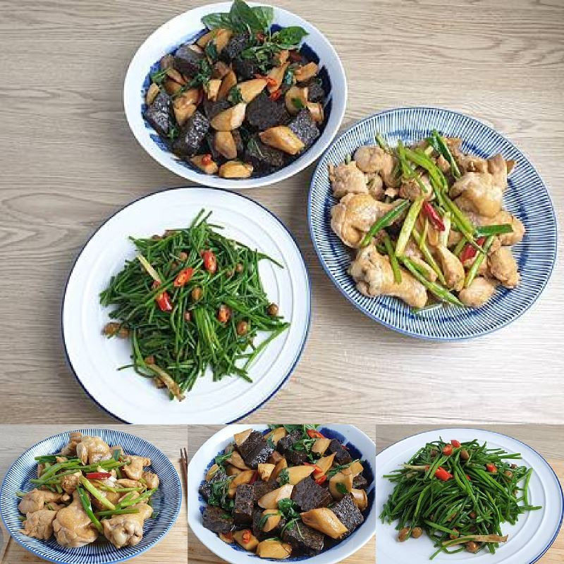 花雕雞、三杯杏鮑菇米血、時蔬樹子炒水蓮