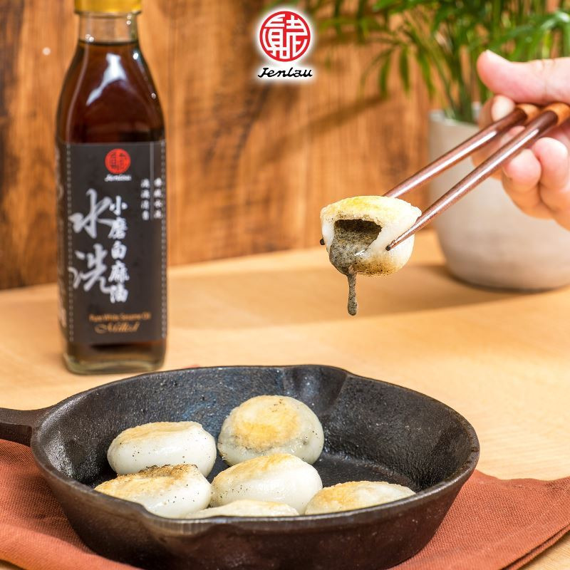 ▶加入適量的真老小磨白麻油,使每顆湯圓均勻沾到